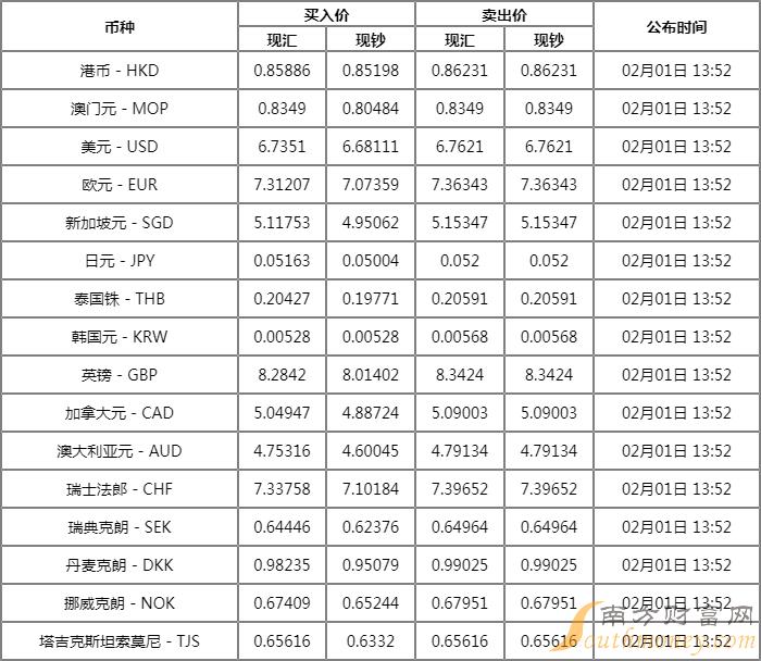 2023年2月1日人民币对美元汇率中间价一览 今日人民币上调112个基点。