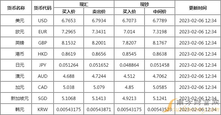 今日人民币汇率中间价一览 2023年2月6日人民币对美元中间价报6.7737,下调355个基点