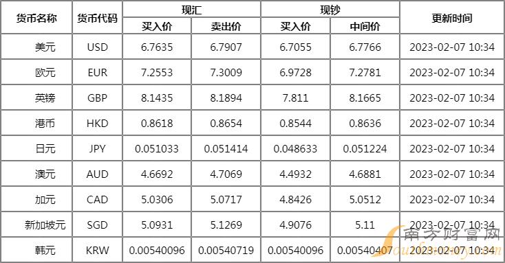 2月7日,人民币兑美元中间价下调230个基点,报6.7967。