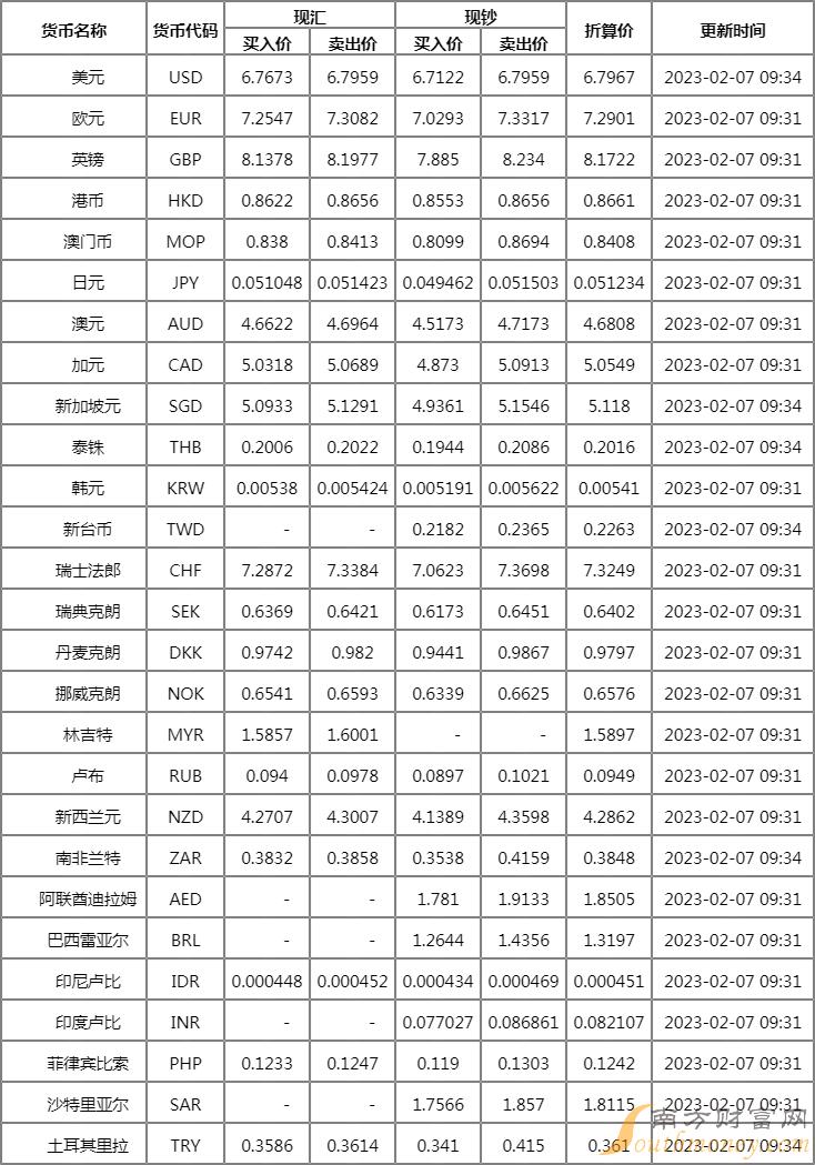 2023年2月7日中国银行外汇牌价查询 中国银行人民币汇率是多少?人民币汇率走势如何?下面同南方财富网蓝猫君来了解一下。