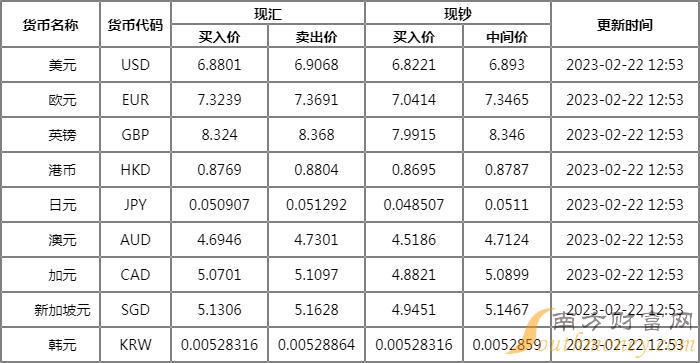 2023年2月22日银行间外汇市场人民币汇率中间价为1美元对人民币6.8759元,1欧元对人民币7.3229元,100日元对人民币5.0975元,1港元对人民币0.87670元,1英镑对人民币8.3289元,1澳大利亚元对人民币4.7190元,1新西兰元对人民币4.2768元,1新加坡元对人民币5.1308元,1瑞士法郎对人民币7.4132元,1加拿大元对人民币5.0805元,人民币1元对0.64503林吉特,人民币1元对10.8724俄罗斯卢布,人民币1元对2.6551南非兰特,人民币1元对189.27韩元,人民币1元对0.53416阿联酋迪拉姆,人民币1元对0.54559沙特里亚尔,人民币1元对52.2730匈牙利福林,人民币1元对0.64819波兰兹罗提,人民币1元对1.0167丹麦克朗,人民币1元对1.5086瑞典克朗,人民币1元对1.4982挪威克朗,人民币1元对2.74340土耳其里拉,人民币1元对2.6817墨西哥比索,人民币1元对5.0382泰铢。