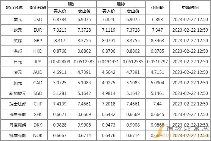 2023年2月22日银行间外汇市场人民币汇率中间价为1美元对人民币6.8759元,1欧元对人民币7.3229元,100日元对人民币5.0975元,1港元对人民币0.87670元,1英镑对人民币8.3289元,1澳大利亚元对人民币4.7190元,1新西兰元对人民币4.2768元,1新加坡元对人民币5.1308元,1瑞士法郎对人民币7.4132元,1加拿大元对人民币5.0805元,人民币1元对0.64503林吉特,人民币1元对10.8724俄罗斯卢布,人民币1元对2.6551南非兰特,人民币1元对189.27韩元,人民币1元对0.53416阿联酋迪拉姆,人民币1元对0.54559沙特里亚尔,人民币1元对52.2730匈牙利福林,人民币1元对0.64819波兰兹罗提,人民币1元对1.0167丹麦克朗,人民币1元对1.5086瑞典克朗,人民币1元对1.4982挪威克朗,人民币1元对2.74340土耳其里拉,人民币1元对2.6817墨西哥比索,人民币1元对5.0382泰铢。