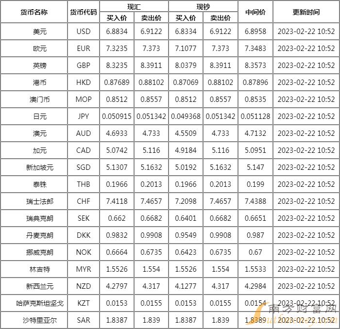 2023年2月22日银行间外汇市场人民币汇率中间价为1美元对人民币6.8759元,1欧元对人民币7.3229元,100日元对人民币5.0975元,1港元对人民币0.87670元,1英镑对人民币8.3289元,1澳大利亚元对人民币4.7190元,1新西兰元对人民币4.2768元,1新加坡元对人民币5.1308元,1瑞士法郎对人民币7.4132元,1加拿大元对人民币5.0805元,人民币1元对0.64503林吉特,人民币1元对10.8724俄罗斯卢布,人民币1元对2.6551南非兰特,人民币1元对189.27韩元,人民币1元对0.53416阿联酋迪拉姆,人民币1元对0.54559沙特里亚尔,人民币1元对52.2730匈牙利福林,人民币1元对0.64819波兰兹罗提,人民币1元对1.0167丹麦克朗,人民币1元对1.5086瑞典克朗,人民币1元对1.4982挪威克朗,人民币1元对2.74340土耳其里拉,人民币1元对2.6817墨西哥比索,人民币1元对5.0382泰铢。