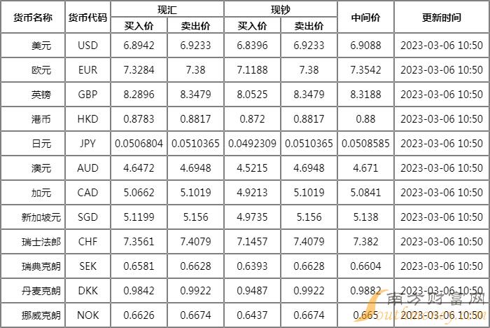 周一浦发银行汇率查询今日2023年3月6日,浦发银行美元等货币汇率多少,下面同南方财富网胡V来看看。