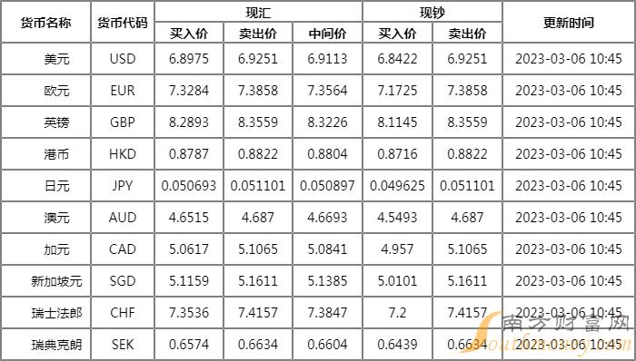 周一华夏银行汇率查询今日价格 华夏银行实时牌价03.06,银行美元等货币汇率多少,下面同南方财富网富贵君来看看。