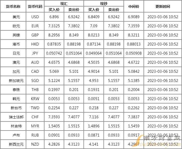 周一平安银行汇率查询今日价格 平安银行实时牌价03.06,银行美元等货币汇率多少,下面同南方财富网畅想君来看看。