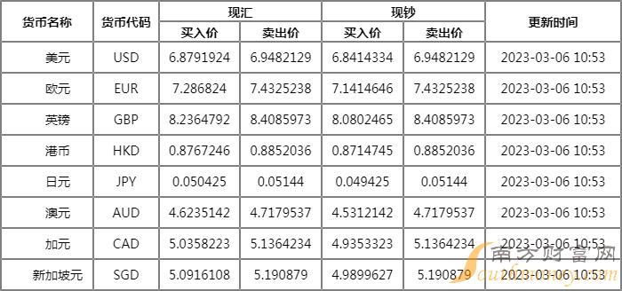 周一汇丰银行外汇牌价实时汇率查询2023.03.06 银行人民币汇率多少,下面同南方财富网火车君来看看。