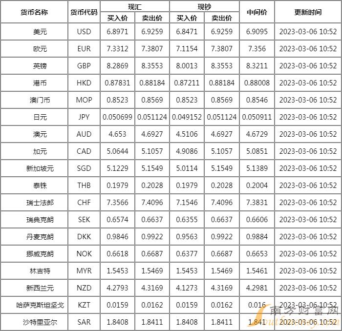 中2023年3月6日银行间外汇市场人民币汇率中间价为:1美元对人民币6.8951元,1欧元对人民币7.3280元,100日元对人民币5.0718元,1港元对人民币0.87837元,1英镑对人民币8.2970元,1澳大利亚元对人民币4.6579元,1新西兰元对人民币4.2841元,1新加坡元对人民币5.1257元,1瑞士法郎对人民币7.3612元,1加拿大元对人民币5.0685元,人民币1元对0.64846马来西亚林吉特,人民币1元对10.9383俄罗斯卢布,人民币1元对2.6301南非兰特,人民币1元对188.12韩元,人民币1元对0.53264阿联酋迪拉姆,人民币1元对0.54428沙特里亚尔,人民币1元对51.6706匈牙利福林,人民币1元对0.64242波兰兹罗提,人民币1元对1.0153丹麦克朗,人民币1元对1.5203瑞典克朗,人民币1元对1.5088挪威克朗,人民币1元对2.73732土耳其里拉,人民币1元对2.6066墨西哥比索,人民币1元对5.0103泰铢。