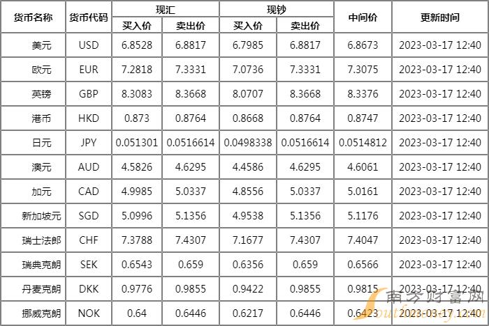 浦发银行外汇牌价表2023年3月17日,人民币对美元汇率多少?下面南方财富网蝴蝶君整理如下: