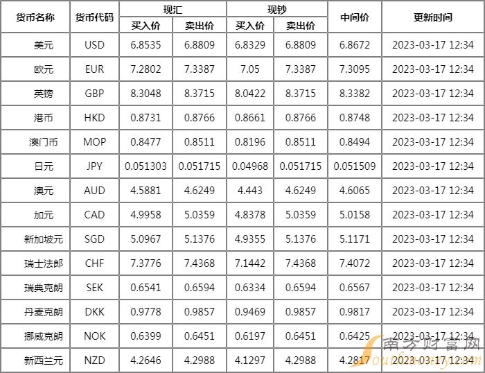广发银行外汇牌价表2023年3月17日,人民币对美元汇率多少?下面南方财富网看点君整理如下: