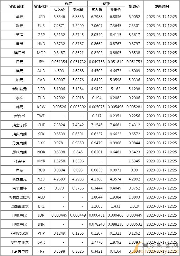xm外汇:中国银行外汇牌价表2023年3月17日 人民币对美元汇率多少?