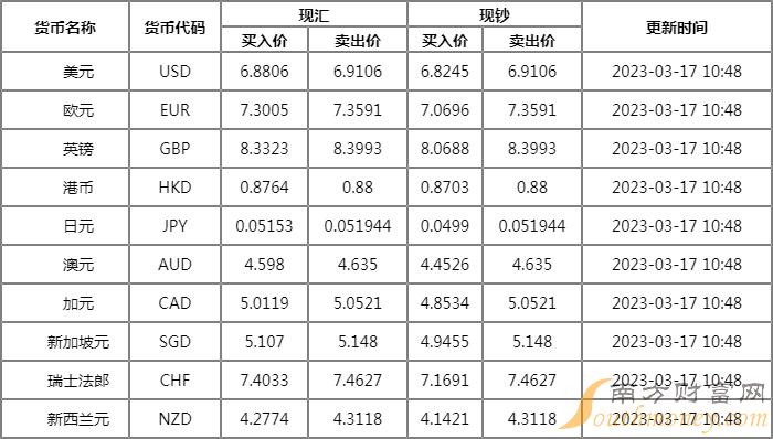 招商银行外汇牌价表2023年3月17日,人民币对美元汇率多少?下面南方财富网小宋整理如下: