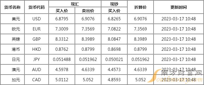 邮储银行外汇牌价表2023年3月17日,人民币对美元汇率多少?下面南方财富网老李整理如下: