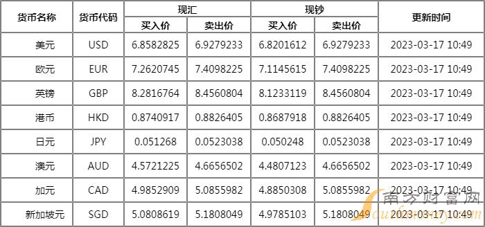 汇丰银行外汇牌价表2023年3月17日,人民币对美元汇率多少?下面南方财富网默默整理如下: