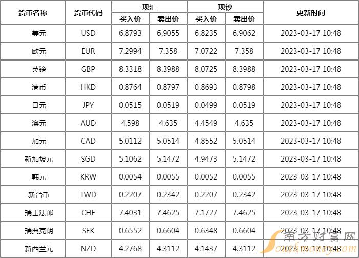 兴业银行外汇牌价表2023年3月17日,人民币对美元汇率多少?下面南方财富网猫宁君整理如下:
