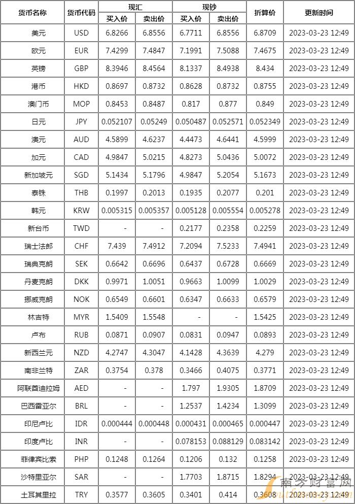 中国外汇交易中心3月23日受权公布人民币对美元、欧元、日元、港元、英镑、澳元、新西兰元、新加坡元、瑞士法郎、加元、林吉特、卢布、兰特、韩元、迪拉姆、里亚尔、福林、兹罗提、丹麦克朗、瑞典克朗、挪威克朗、里拉、墨西哥比索及泰铢的市场汇价。