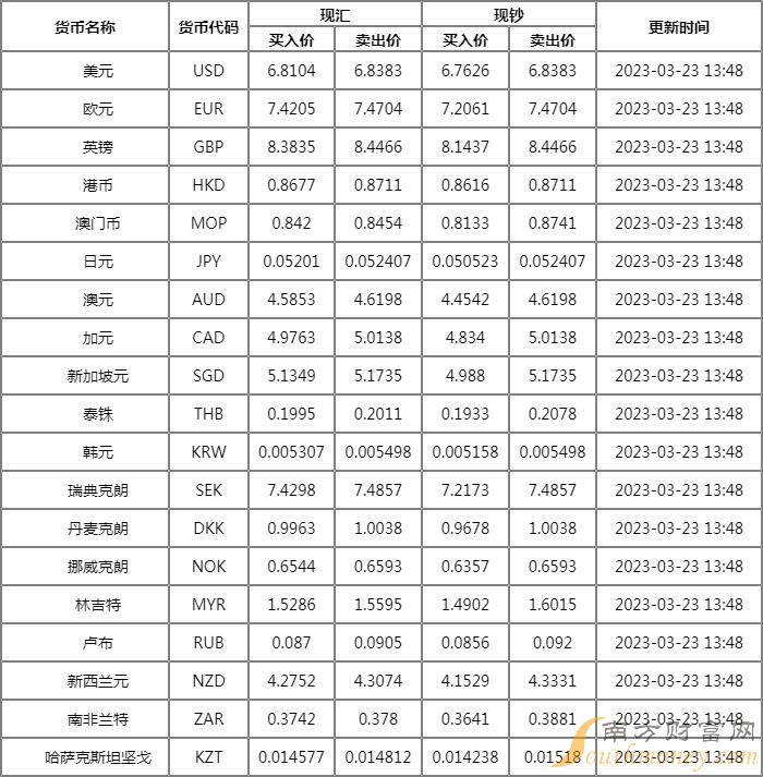2023年3月23日银行间外汇市场人民币汇率中间价为1美元对人民币6.8709元,1欧元对人民币7.4675元,100日元对人民币5.2349元,1港元对人民币0.87554元,1英镑对人民币8.4340元,1澳大利亚元对人民币4.5999元,1新西兰元对人民币4.2790元,1新加坡元对人民币5.1673元,1瑞士法郎对人民币7.4941元,1加拿大元对人民币5.0072元,人民币1元对0.64830林吉特,人民币1元对11.2031俄罗斯卢布,人民币1元对2.6521南非兰特,人民币1元对189.46韩元,人民币1元对0.53449阿联酋迪拉姆,人民币1元对0.54664沙特里亚尔,人民币1元对51.8480匈牙利福林,人民币1元对0.62735波兰兹罗提,人民币1元对0.9971丹麦克朗,人民币1元对1.4995瑞典克朗,人民币1元对1.5201挪威克朗,人民币1元对2.77165土耳其里拉,人民币1元对2.7084墨西哥比索,人民币1元对4.9763泰铢。