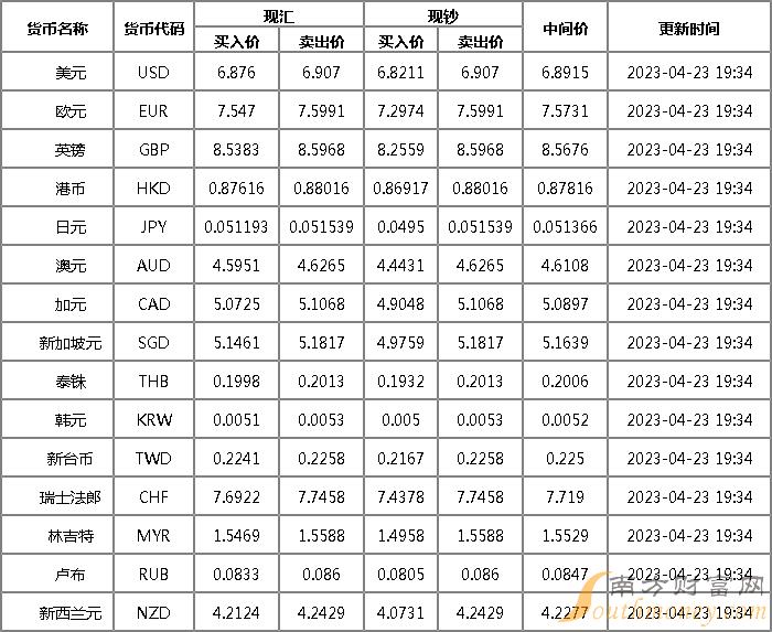 2023年4月20日银行间外汇市场人民币汇率中间价为:1美元对人民币6.8987元,1欧元对人民币7.5537元,100日元对人民币5.1206元,1港元对人民币0.87895元,1英镑对人民币8.5731元,1澳大利亚元对人民币4.6249元,1新西兰元对人民币4.2518元,1新加坡元对人民币5.1674元,1瑞士法郎对人民币7.6839元,1加拿大元对人民币5.1220元,人民币1元对0.64366马来西亚林吉特,人民币1元对11.8526俄罗斯卢布,人民币1元对2.6379南非兰特,人民币1元对192.48韩元,人民币1元对0.53235阿联酋迪拉姆,人民币1元对0.54371沙特里亚尔,人民币1元对50.1400匈牙利福林,人民币1元对0.61155波兰兹罗提,人民币1元对0.9866丹麦克朗,人民币1元对1.5013瑞典克朗,人民币1元对1.5349挪威克朗,人民币1元对2.81229土耳其里拉,人民币1元对2.6168墨西哥比索,人民币1元对4.9952泰铢。