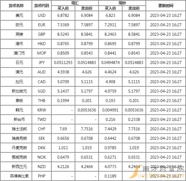 2023年4月20日银行间外汇市场人民币汇率中间价为:1美元对人民币6.8987元,1欧元对人民币7.5537元,100日元对人民币5.1206元,1港元对人民币0.87895元,1英镑对人民币8.5731元,1澳大利亚元对人民币4.6249元,1新西兰元对人民币4.2518元,1新加坡元对人民币5.1674元,1瑞士法郎对人民币7.6839元,1加拿大元对人民币5.1220元,人民币1元对0.64366马来西亚林吉特,人民币1元对11.8526俄罗斯卢布,人民币1元对2.6379南非兰特,人民币1元对192.48韩元,人民币1元对0.53235阿联酋迪拉姆,人民币1元对0.54371沙特里亚尔,人民币1元对50.1400匈牙利福林,人民币1元对0.61155波兰兹罗提,人民币1元对0.9866丹麦克朗,人民币1元对1.5013瑞典克朗,人民币1元对1.5349挪威克朗,人民币1元对2.81229土耳其里拉,人民币1元对2.6168墨西哥比索,人民币1元对4.9952泰铢。