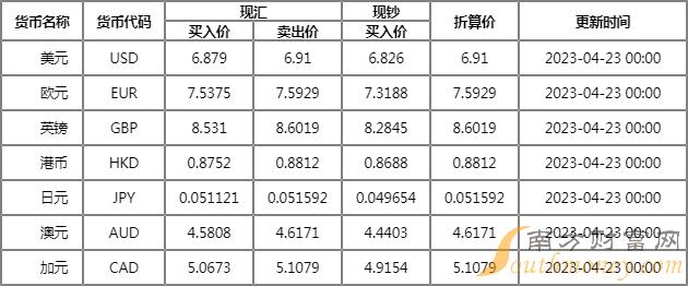 2023年4月20日银行间外汇市场人民币汇率中间价为:1美元对人民币6.8987元,1欧元对人民币7.5537元,100日元对人民币5.1206元,1港元对人民币0.87895元,1英镑对人民币8.5731元,1澳大利亚元对人民币4.6249元,1新西兰元对人民币4.2518元,1新加坡元对人民币5.1674元,1瑞士法郎对人民币7.6839元,1加拿大元对人民币5.1220元,人民币1元对0.64366马来西亚林吉特,人民币1元对11.8526俄罗斯卢布,人民币1元对2.6379南非兰特,人民币1元对192.48韩元,人民币1元对0.53235阿联酋迪拉姆,人民币1元对0.54371沙特里亚尔,人民币1元对50.1400匈牙利福林,人民币1元对0.61155波兰兹罗提,人民币1元对0.9866丹麦克朗,人民币1元对1.5013瑞典克朗,人民币1元对1.5349挪威克朗,人民币1元对2.81229土耳其里拉,人民币1元对2.6168墨西哥比索,人民币1元对4.9952泰铢。