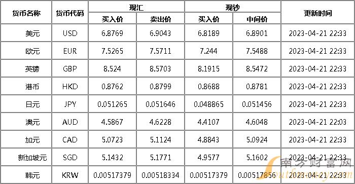 2023年4月21日银行间外汇市场人民币汇率中间价为:1美元对人民币6.8752元,1欧元对人民币7.5400元,100日元对人民币5.1271元,1港元对人民币0.87609元,1英镑对人民币8.5512元,1澳大利亚元对人民币4.6355元,1新西兰元对人民币4.2457元,1新加坡元对人民币5.1598元,1瑞士法郎对人民币7.7026元,1加拿大元对人民币5.0999元,人民币1元对0.64498马来西亚林吉特,人民币1元对11.8639俄罗斯卢布,人民币1元对2.6225南非兰特,人民币1元对192.52韩元,人民币1元对0.53411阿联酋迪拉姆,人民币1元对0.54555沙特里亚尔,人民币1元对49.9778匈牙利福林,人民币1元对0.60985波兰兹罗提,人民币1元对0.9884丹麦克朗,人民币1元对1.4995瑞典克朗,人民币1元对1.5404挪威克朗,人民币1元对2.82241土耳其里拉,人民币1元对2.6180墨西哥比索,人民币1元对4.9930泰铢。