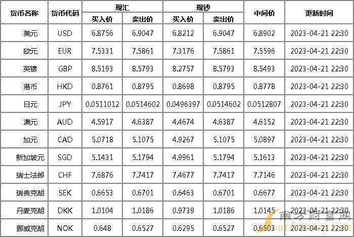 2023年4月21日银行间外汇市场人民币汇率中间价为:1美元对人民币6.8752元,1欧元对人民币7.5400元,100日元对人民币5.1271元,1港元对人民币0.87609元,1英镑对人民币8.5512元,1澳大利亚元对人民币4.6355元,1新西兰元对人民币4.2457元,1新加坡元对人民币5.1598元,1瑞士法郎对人民币7.7026元,1加拿大元对人民币5.0999元,人民币1元对0.64498马来西亚林吉特,人民币1元对11.8639俄罗斯卢布,人民币1元对2.6225南非兰特,人民币1元对192.52韩元,人民币1元对0.53411阿联酋迪拉姆,人民币1元对0.54555沙特里亚尔,人民币1元对49.9778匈牙利福林,人民币1元对0.60985波兰兹罗提,人民币1元对0.9884丹麦克朗,人民币1元对1.4995瑞典克朗,人民币1元对1.5404挪威克朗,人民币1元对2.82241土耳其里拉,人民币1元对2.6180墨西哥比索,人民币1元对4.9930泰铢。