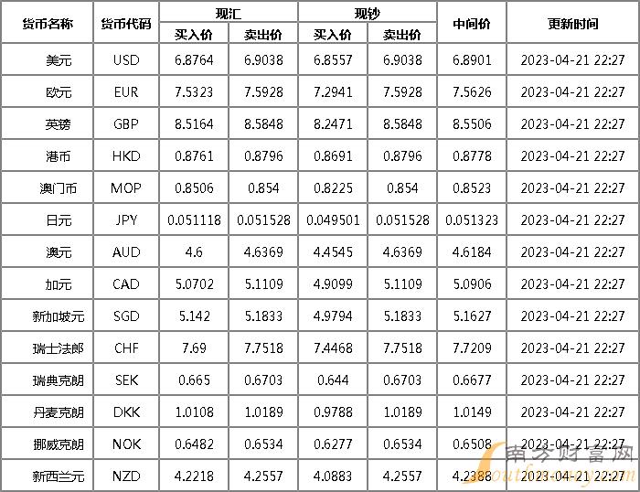 xm外汇:2023年4月21日广发银行外汇牌价一览 人民币对美元汇率多少?