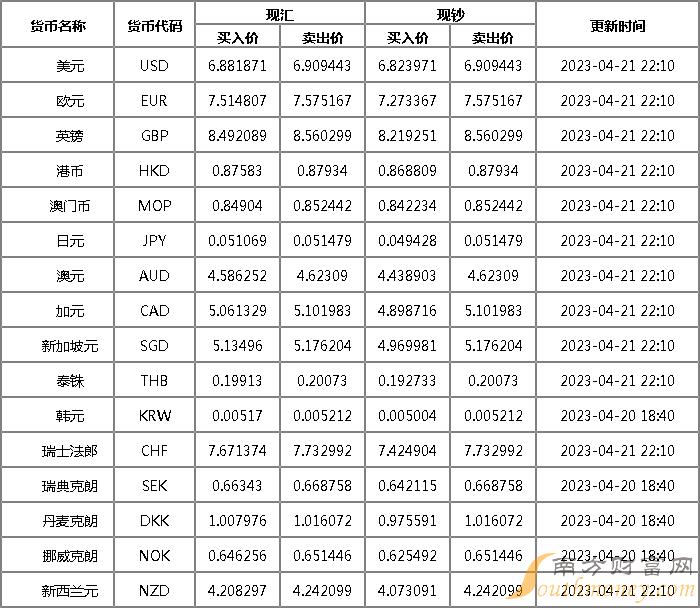 xm外汇:光大银行外汇牌价一览2023年4月21日人民币对美元汇率多少?