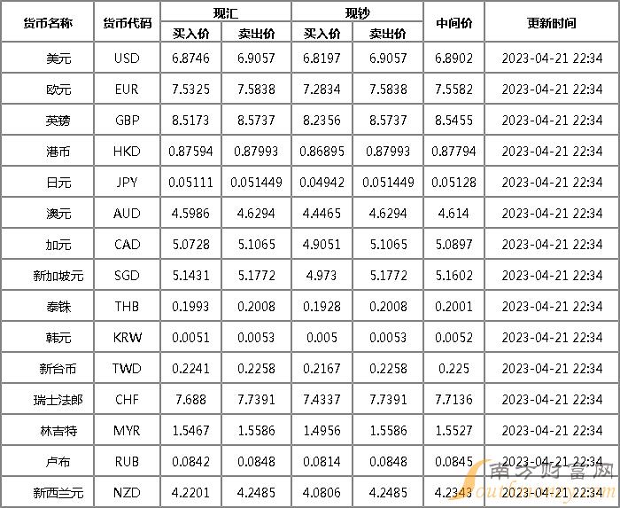 2023年4月21日银行间外汇市场人民币汇率中间价为:1美元对人民币6.8752元,1欧元对人民币7.5400元,100日元对人民币5.1271元,1港元对人民币0.87609元,1英镑对人民币8.5512元,1澳大利亚元对人民币4.6355元,1新西兰元对人民币4.2457元,1新加坡元对人民币5.1598元,1瑞士法郎对人民币7.7026元,1加拿大元对人民币5.0999元,人民币1元对0.64498马来西亚林吉特,人民币1元对11.8639俄罗斯卢布,人民币1元对2.6225南非兰特,人民币1元对192.52韩元,人民币1元对0.53411阿联酋迪拉姆,人民币1元对0.54555沙特里亚尔,人民币1元对49.9778匈牙利福林,人民币1元对0.60985波兰兹罗提,人民币1元对0.9884丹麦克朗,人民币1元对1.4995瑞典克朗,人民币1元对1.5404挪威克朗,人民币1元对2.82241土耳其里拉,人民币1元对2.6180墨西哥比索,人民币1元对4.9930泰铢。