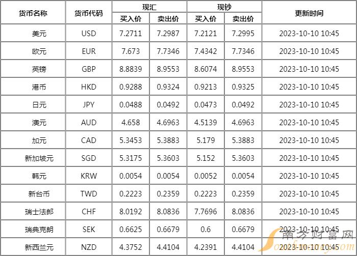xm外汇:兴业银行汇率牌价表(2023年10月10日)
