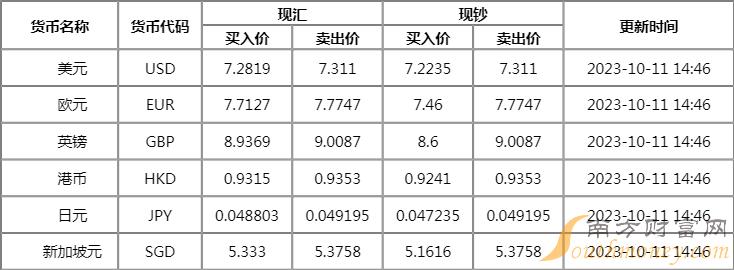 今日渤海银行外汇牌价表一览2023年,2023年10月11日人民币汇率实时查询,人民币兑美元中间价上调2个基点,报7.1779。