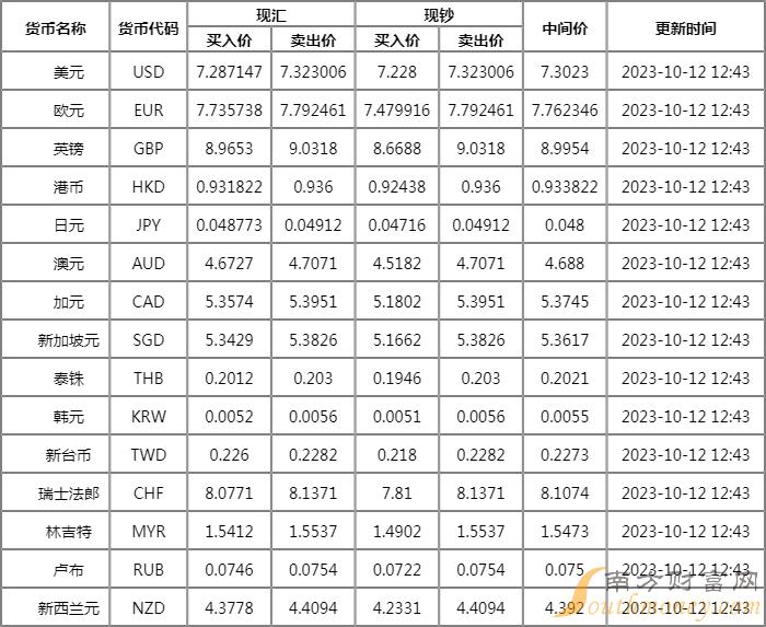 最新平安银行汇率牌价表一览10月12日人民币汇率今日查询表。2023年10月12日,人民币兑美元中间价上调3个基点,报7.1776。随南方财富网李才君来看看。