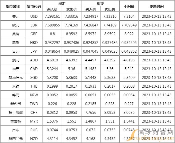 2023年10月13日银行间外汇市场人民币汇率中间价为:1美元对人民币7.1775元,1欧元对人民币7.6045元,100日元对人民币4.8258元,1港元对人民币0.91747元,1英镑对人民币8.7990元,1澳大利亚元对人民币4.5694元,1新西兰元对人民币4.2941元,1新加坡元对人民币5.2682元,1瑞士法郎对人民币7.9575元,1加拿大元对人民币5.2809元,人民币1元对0.65798马来西亚林吉特,人民币1元对13.4998俄罗斯卢布,人民币1元对2.6409南非兰特,人民币1元对185.52韩元,人民币1元对0.50969阿联酋迪拉姆,人民币1元对0.52042沙特里亚尔,人民币1元对51.1667匈牙利福林,人民币1元对0.59978波兰兹罗提,人民币1元对0.9841丹麦克朗,人民币1元对1.5216瑞典克朗,人民币1元对1.5204挪威克朗,人民币1元对3.85538土耳其里拉,人民币1元对2.5031墨西哥比索,人民币1元对5.0130泰铢。
