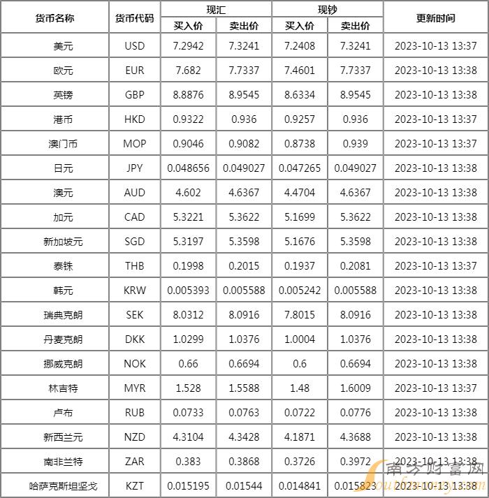 10月13日建设银行外汇汇率牌价一览?今日人民币汇率中间价是多少?随南方财富网畅想君来看看。