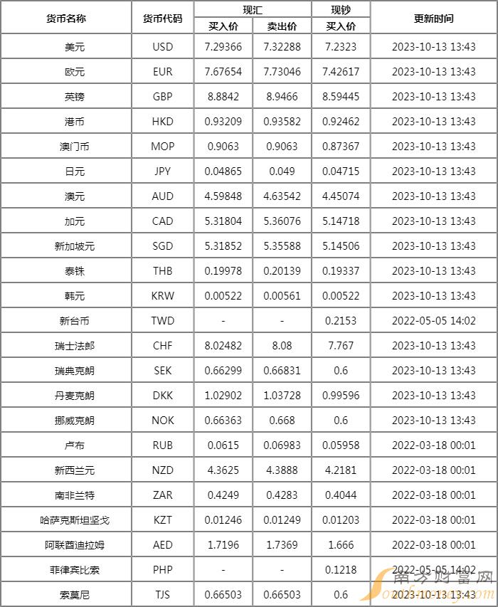 10月13日农业银行外汇汇率牌价一览?今日人民币汇率中间价是多少?随南方财富网汇财君来看看。