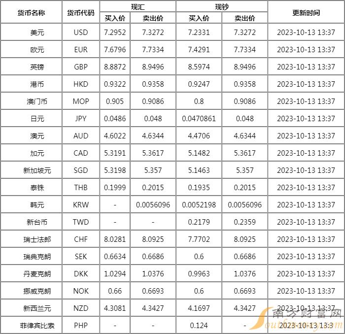 xm外汇:交通银行外汇牌价表2023 10月13日交行人民币汇率是多少?