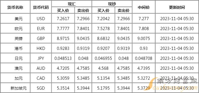 11月4日上海农村商业银行外汇牌价一览,人民币对美元汇率是多少?随南方财富网吾悟君来看看。