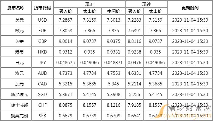 11月4日华夏银行外汇牌价表,人民币对美元汇率是多少?随南方财富网吾浦君来看看。
