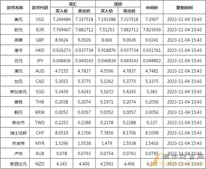 11月4日平安银行外汇牌价表,人民币对美元汇率是多少?随南方财富网胡V来看看。