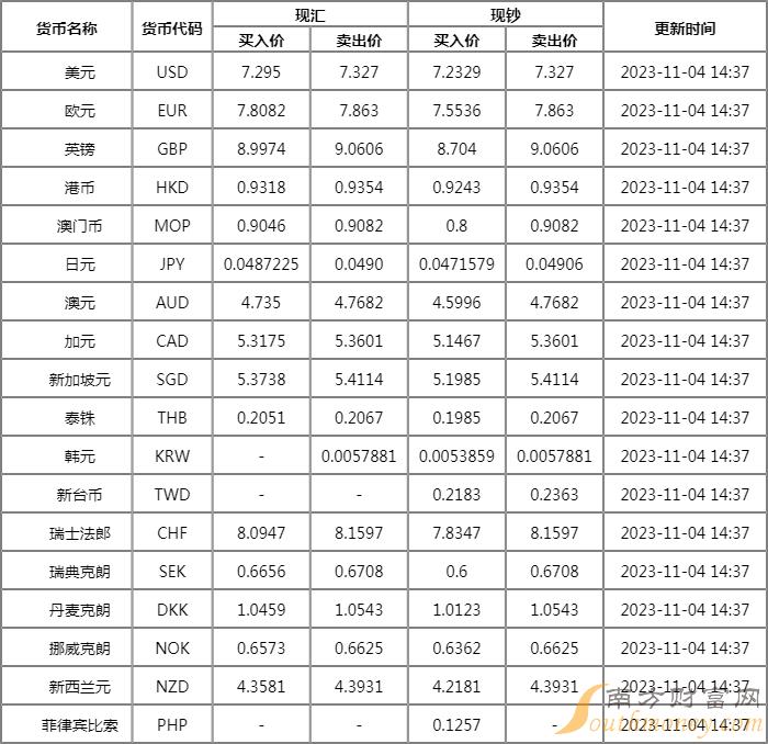 11月4日中国交通银行外汇牌价表,人民币汇率是多少?随南方财富网小红帽来看看。