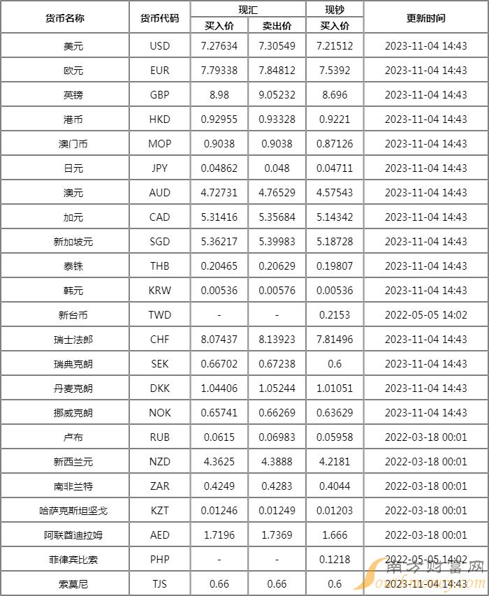 11月4日中国农业银行外汇牌价表,人民币汇率是多少?随南方财富网路路来看看。