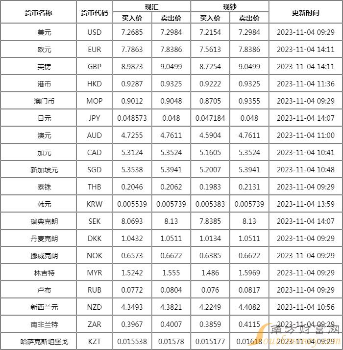 11月4日中国建设银行外汇牌价表,人民币汇率是多少?随南方财富网圈圈来看看。