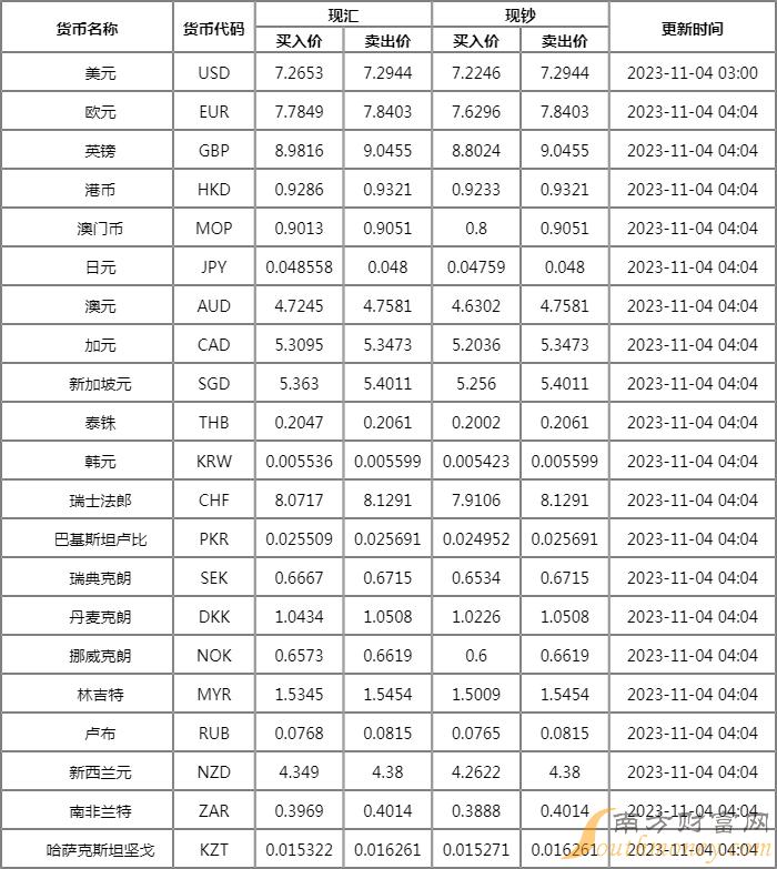 xm外汇:中国工商银行外汇牌价表11月4日 工行人民币汇率是多少?
