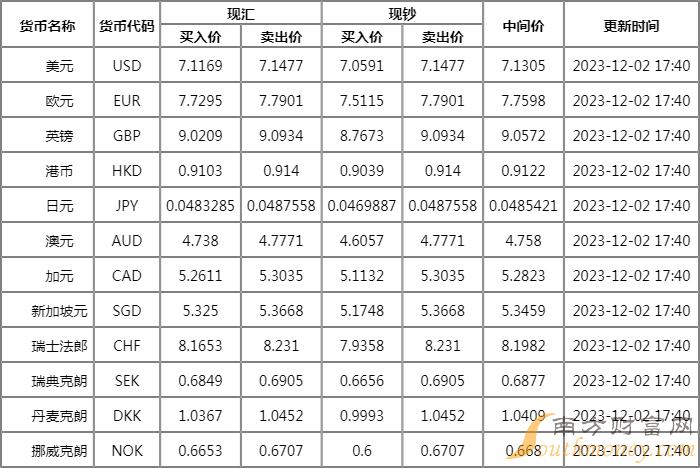 xm外汇:浦发银行外汇牌价查询2023年 12月2日人民币汇率是多少?