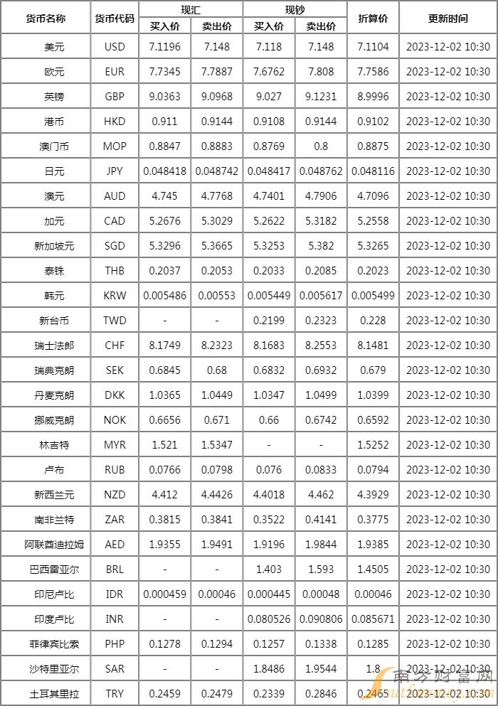 xm外汇:中国银行外汇牌价查询2023年 12月2日人民币汇率是多少?