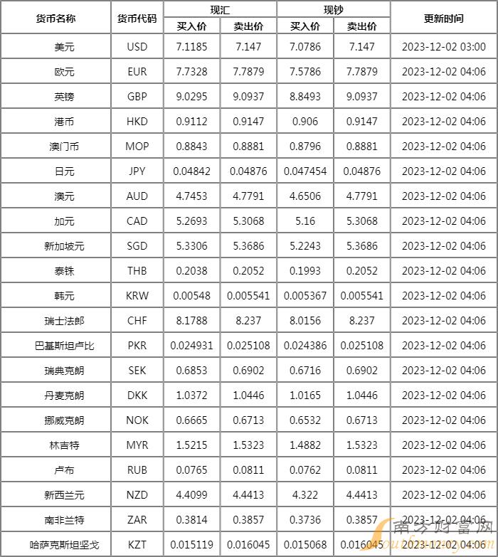2023年12月1日银行间外汇市场人民币汇率中间价为:1美元对人民币7.1104元,1欧元对人民币7.7586元,100日元对人民币4.8116元,1港元对人民币0.91022元,1英镑对人民币8.9996元,1澳大利亚元对人民币4.7096元,1新西兰元对人民币4.3929元,1新加坡元对人民币5.3265元,1 瑞士法郎对人民币8.1481元,1加拿大元对人民币5.2558元,人民币1元对0.65566马来西亚林吉特,人民币1元对12.6003俄罗斯卢布,人民币1元对2.6491南非兰特,人民币1元对181.86韩元,人民币1元对0.51586阿联酋迪拉姆,人民币1元对0.52694沙特里亚尔,人民币1元对49.1106匈牙利福林,人民币1元对0.56178波兰兹罗提,人民币1元对0.9616丹麦克朗,人民币1元对1.4728瑞典克朗,人民币1元对1.5171挪威克朗,人民币1元对4.05753土耳其里拉,人民币1元对2.4465墨西哥比索,人民币1元对4.9441泰铢。