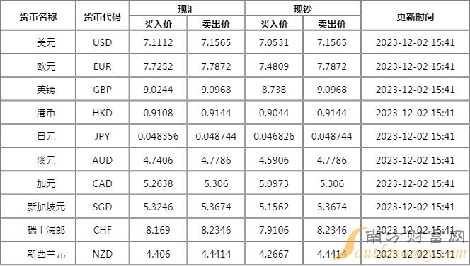 xm外汇:招商银行外汇牌价表2023年12月2日 人民币汇率多少?