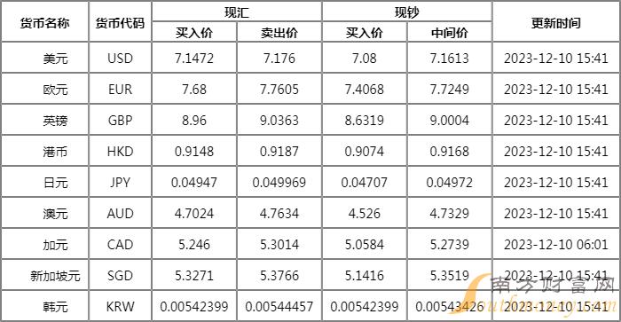 2023年12月8日银行间外汇市场人民币汇率中间价为:1美元对人民币7.1123元,1欧元对人民币7.6792元,100日元对人民币4.9431元,1港元对人民币0.91045元,1英镑对人民币8.9492元,1澳大利亚元对人民币4.6926元,1新西兰元对人民币4.3883元,1新加坡元对人民币5.3153元,1瑞士法郎对人民币8.1304元,1加拿大元对人民币5.2336元,人民币1元对0.65662马来西亚林吉特,人民币1元对12.9723俄罗斯卢布,人民币1元对2.6454南非兰特,人民币1元对184.33韩元,人民币1元对0.51635阿联酋迪拉姆,人民币1元对0.52742沙特里亚尔,人民币1元对49.7833匈牙利福林,人民币1元对0.56467波兰兹罗提,人民币1元对0.9724丹麦克朗,人民币1元对1.4596瑞典克朗,人民币1元对1.5285挪威克朗,人民币1元对4.06545土耳其里拉,人民币1元对2.4590墨西哥比索,人民币1元对4.9297泰铢。