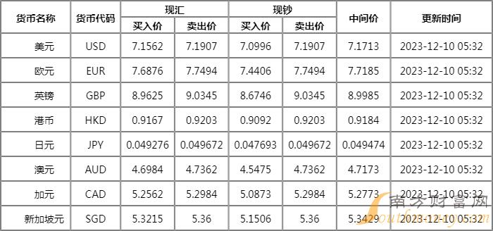 上海农村商业银行外汇牌价表2023年12月10日 人民币对美元汇率是多少?随南方财富网微聊君来看看。