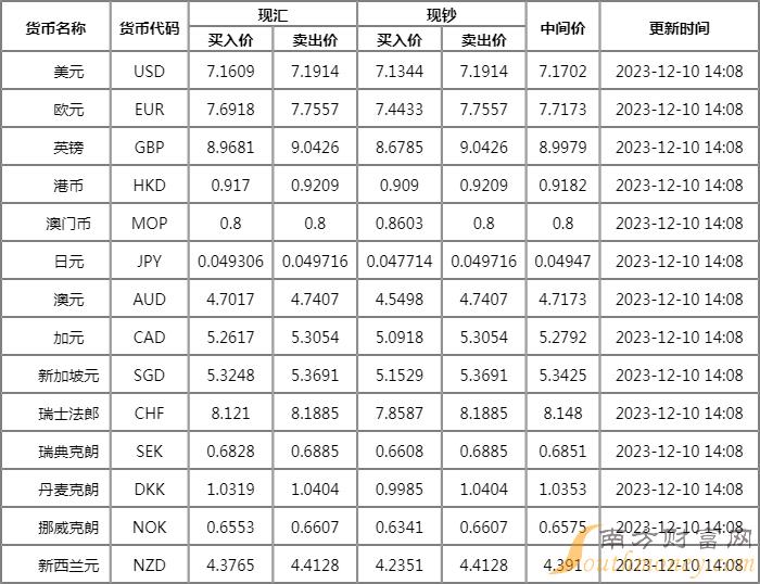 广发银行外汇牌价表2023年12月10日 人民币对美元汇率是多少?随南方财富网老白来看看。